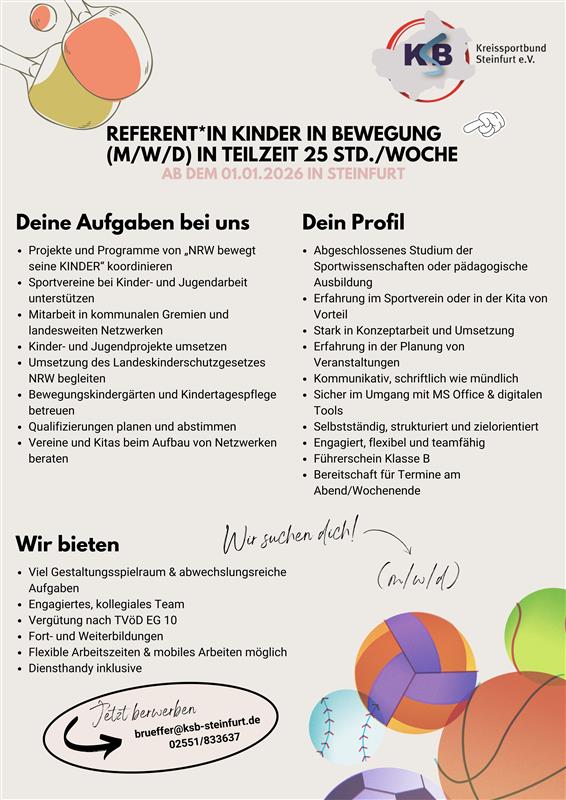 Wenn Sie sich in diesem Profil wiederfinden und Lust haben, den Kinder- und Jugendsport im Kreis Steinfurt aktiv mitzugestalten, freuen wir uns auf Ihre Bewerbung!